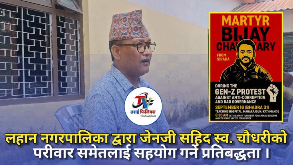 २ आश्विन लहान । जेन जि आन्दोलनका क्रममा काठमाण्डौमा ज्यान गुमाइएका सहिद स्व.बिजय चौधरीको परीवार लगायत श्रीमती छोरीलाइ समेत नगरपालिकाका मेयर चौधरीले सहयोग गर्ने घोषणा गरेको छ।