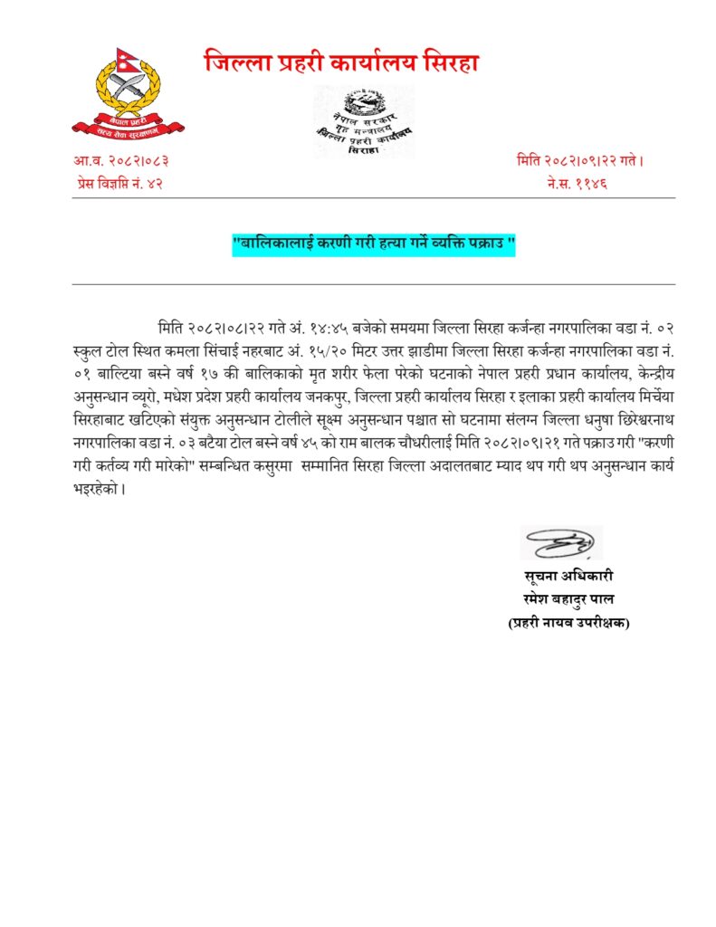 लहान २२ पुस । सिरहाको कर्जन्हा नगरपालिका–२, स्कुल टोलस्थित कमला सिँचाइ नहर नजिक झाडीमा १७ वर्षीया किशोरी अविना वैध मृत अवस्थामा फेला परेको घटनामा संलग्न अभियुक्तलाई प्रहरीले पक्राउ गरी सार्वजनिक गरेको छ। जिल्ला प्रहरी कार्यालय सिरहाका अनुसार मिति २०८२/०८/२२ गते दिउँसो करिब १४:४५ बजे अविना वैधको शव फेला परेको सूचना प्राप्त हुनासाथ प्रहरी उपरीक्षक (प्र.उ.) अनन्त राम शर्माको कमाण्डमा प्रहरी टोली घटनास्थलमा खटिएको थियो। घटनाको गम्भीरतालाई मध्यनजर गर्दै मधेश प्रदेश प्रहरी कार्यालयबाट डग स्निफिङ टोली समेत परिचालन गरिएको थियो। घटनास्थलको मुचुल्का पश्चात शवलाई वि.पी. कोइराला स्वास्थ्य विज्ञान प्रतिष्ठान, धरानमा पोस्टमार्टमका लागि पठाइएको थियो।