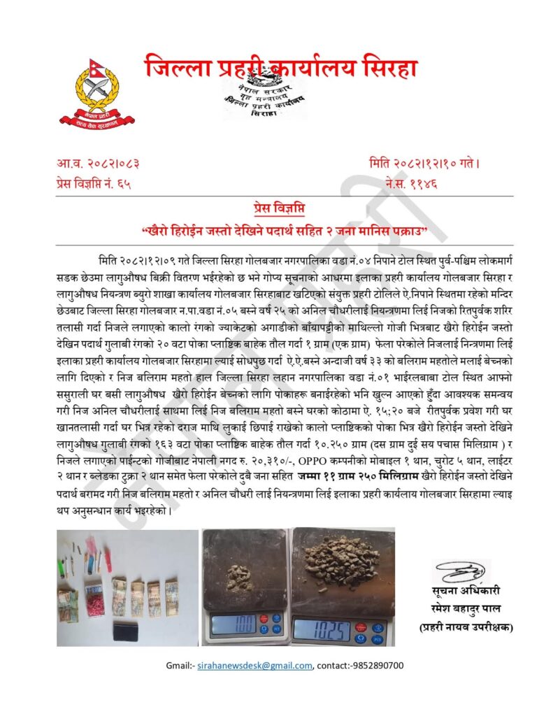१० गते चैत लहान । जिल्ला सिरहा गोलबजार नगरपालिका वडा नं. ४ निपनिया टोल स्थितबाट १० ग्राम २५० मिलिग्राम खैरोगिरोइन सहित चौधरी र महतोलाई प्रहरीले पक्राउ गरेको छ।