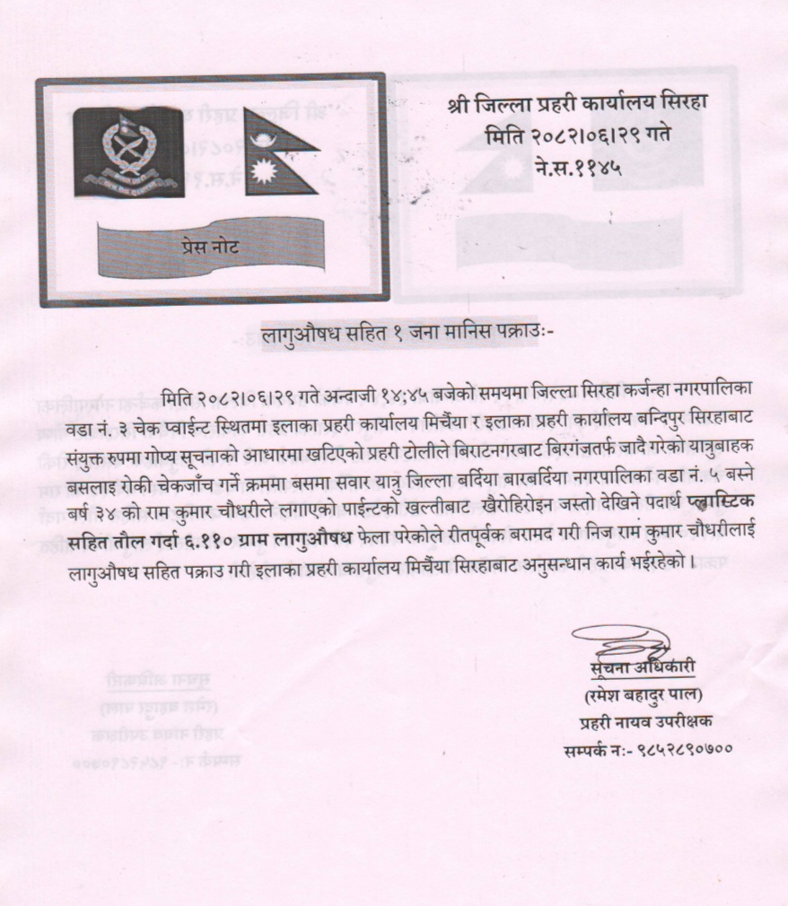 ३० असोज लहान। जिल्ला सिरहा कर्जन्हा नगरपालिका वडा नं. ३ चेक प्वाईन्ट स्थितमा मिति २०८२ असोज २९ गते अन्दाजी २;४५ बजेको समयमा इलाका प्रहरी कार्यालय मिर्चैया र इलाका प्रहरी कार्यालय बन्दिपुर सिरहाबाट संयुक्त रुपमा गोप्य सूचनाको आधारमा खटिएको प्रहरी टोलीले बिराटनगरबाट बिरगंजतर्फ जादै गरेको यात्रुबाहक बसलाइ रोकी चेकजाँच गर्ने क्रममा बसमा सवार यात्रु जिल्ला बर्दिया बारबर्दिया नगरपालिका वडा नं. ५ बस्ने बर्ष ३४ को राम कुमार चौधरीले लगाएको पाईन्टको खल्तीबाट खैरोहिरोइन जस्तो देखिने पदार्थ प्लास्टिक सहित तौल गर्दा ६.११० ग्राम लागुऔषध फेला परेकोले रीतपूर्वक बरामद गरी निज राम कुमार चौधरीलाई लागुऔषध सहित पक्राउ गरी इलाका प्रहरी कार्यालय मिर्चैया सिरहाबाट अनुसन्धान कार्य भईरहेको जिप्रका सिरहाले जनाएको छ ।