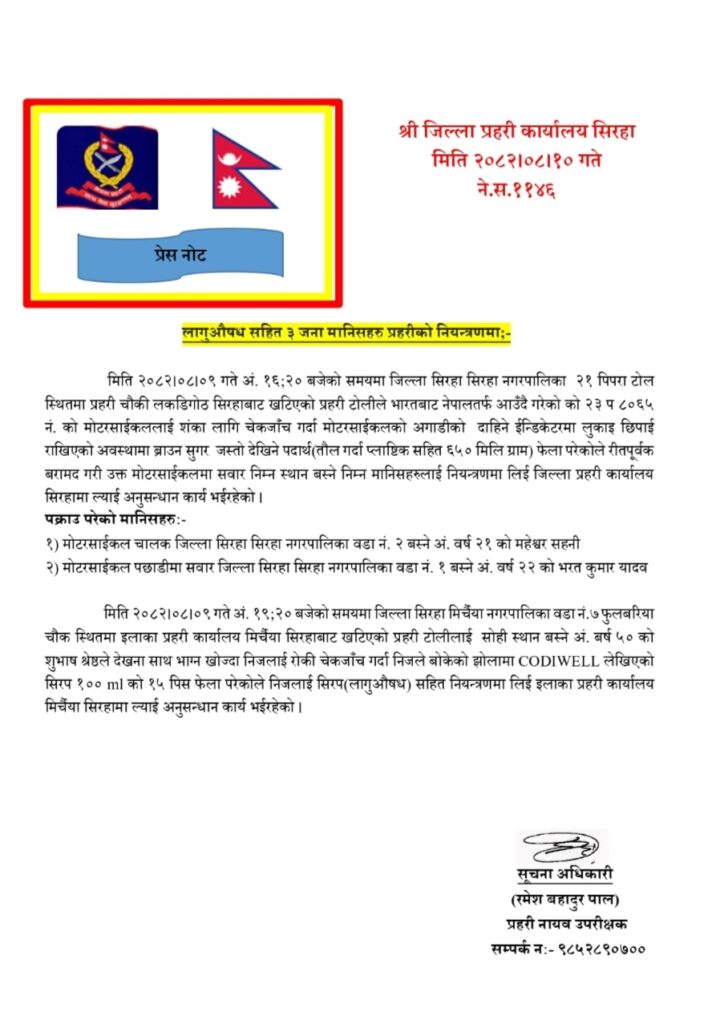१० मंसिर लहान। जिल्ला सिरहा सिरहा नगरपालिका २१ पिपरा टोल स्थितमा मिति २०८२ मंसिर ९ गते अं ४:२० बजेको समयमा प्रहरी चौकी लकडिगोठ सिरहाबाट खटिएको प्रहरी टोलीले भारतबाट नेपालतर्फ आउँदै गरेको को २३ प ८०६५ नं. को मोटरसाईकललाई शंका लागि चेकजाँच गर्दा मोटरसाईकलको अगाडीको’ दाहिने ईन्डकेटरमा लुकाइ छिपाई राखिएको अवस्थामा ब्राउन सुगर जस्तो देखिने पदार्थ(तौल गर्दा प्लाष्टिक सहित ६५० मिलि ग्राम) फेला परेकोले रीतपूर्वक बरामद गरी उक्त मोटरसाईकलमा सवार निम्न स्थान बस्ने मोटरसाईकल चालक जिल्ला सिरहा सिरहा नगरपालिका वडा नं. २ बस्ने अं. वर्ष २१ को महेश्वर सहनी र मोटरसाईकल पछाडीमा सवार जिल्ला सिरहा सिरहा नगरपालिका वडा नं.१ बस्ने अं. वर्ष २२ को भरत कुमार यादवलाई नियन्त्रणमा लिई जिल्ला प्रहरी कार्यालय सिरहामा ल्याई अनुसन्धान कार्य भईरहेको छ।
