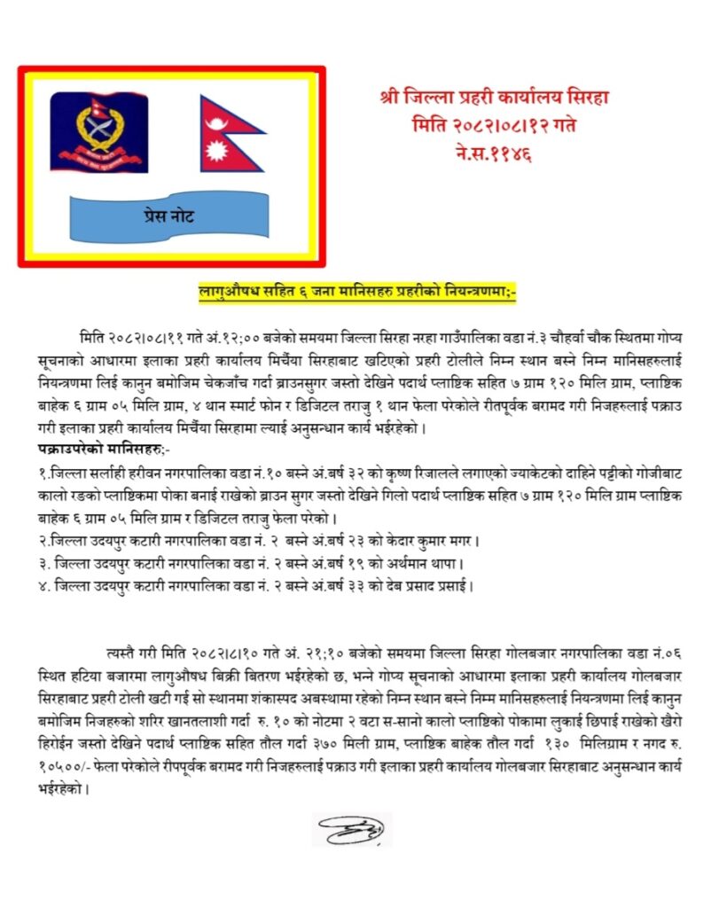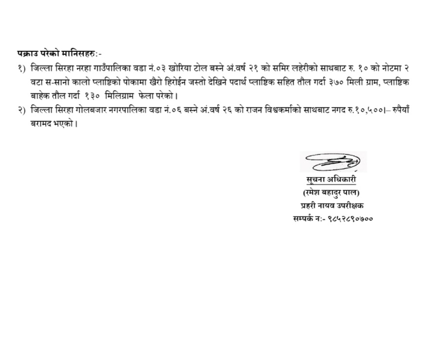 त्यस्तैगरी मिति २०८२ मंसिर १० गते अं. ९:१० बजेको समयमा जिल्ला सिरहा गोलबजार नगरपालिका वडा नं.०६ स्थित हटिया बजारमा लागुऔषध बिक्री बितरण भईरहेको छ भन्ने गोप्य सूचनाको आधारमा इलाका प्रहरी कार्यालय गोलबजार सिरहाबाट प्रहरी टोली खटी गई सो स्थानमा शंकास्पद अबस्थामा रहेको निम्न स्थान बस्ने निम्म मानिसहरुलाई नियन्त्रणमा लिई कानुन बमोजिम निजहरुको शरिर खानतलाशी गर्दां रु.१० को नोटमा २ वटा स-सानो कालो प्लाष्टिको पोकामा लूकाई छिपाई राखेको खैरो हिर्ोईन जस्तो देखिने पदार्थ प्लाष्टिक सहित तौल गर्दा ३७० मिली ग्राम, प्लाष्टिक बाहेक तौल गर्दां १२० मिलिग्राम र नगद रू. १०५००- फेला परेंकोले रीपपूर्वक बरामद गरी निजहरुलाईं पक्राउ गरी इलाका प्रहरी कायालय गोलबजार सिरहाबाट अनुसन्धान कायं भईरहेको जिप्रका सिरहाले जनाएको छ।